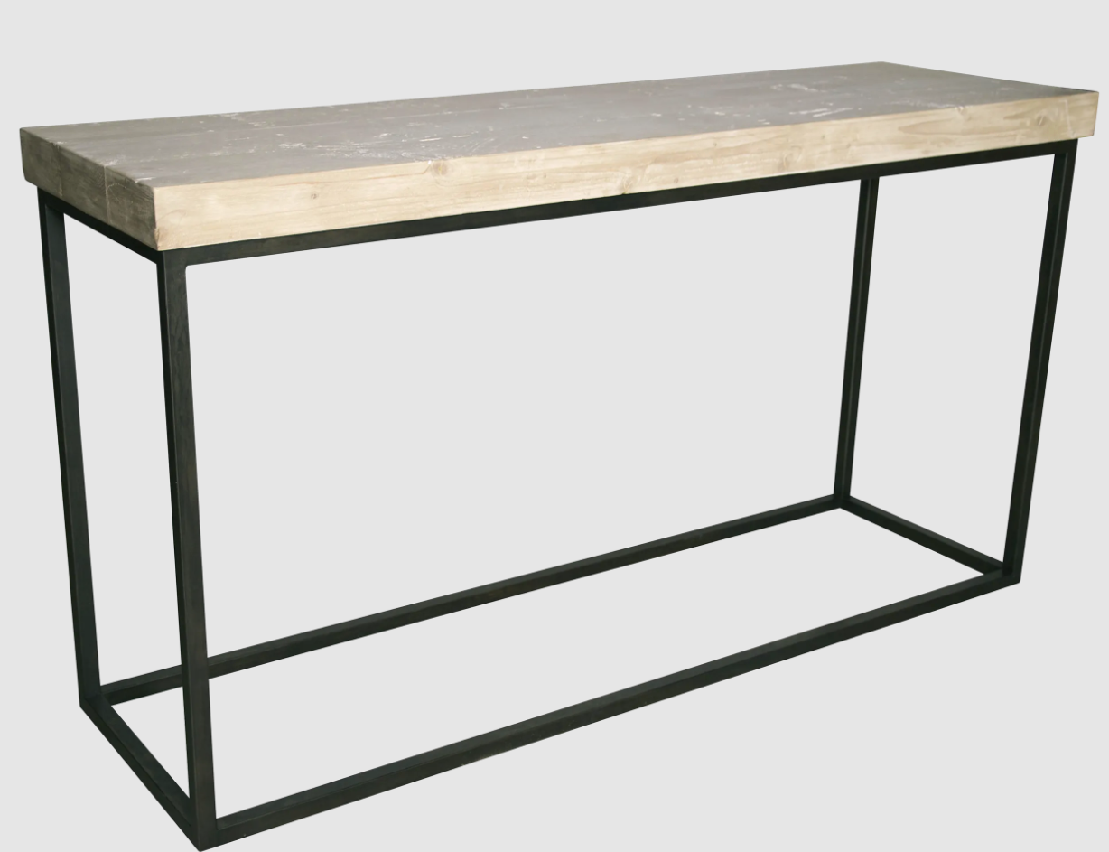 A study in balance and restraint, the Branford Console combines an industrial steel base with a reclaimed Douglas fir top. The simple rectilinear form lets the natural character of the wood take center stage, with nail-holes, gouges, and other marks of age celebrated rather than concealed. A grey wash wax finish lends a soft tonal contrast against the dark steel frame, making this piece equally at home in modern, rustic, or transitional interiors.