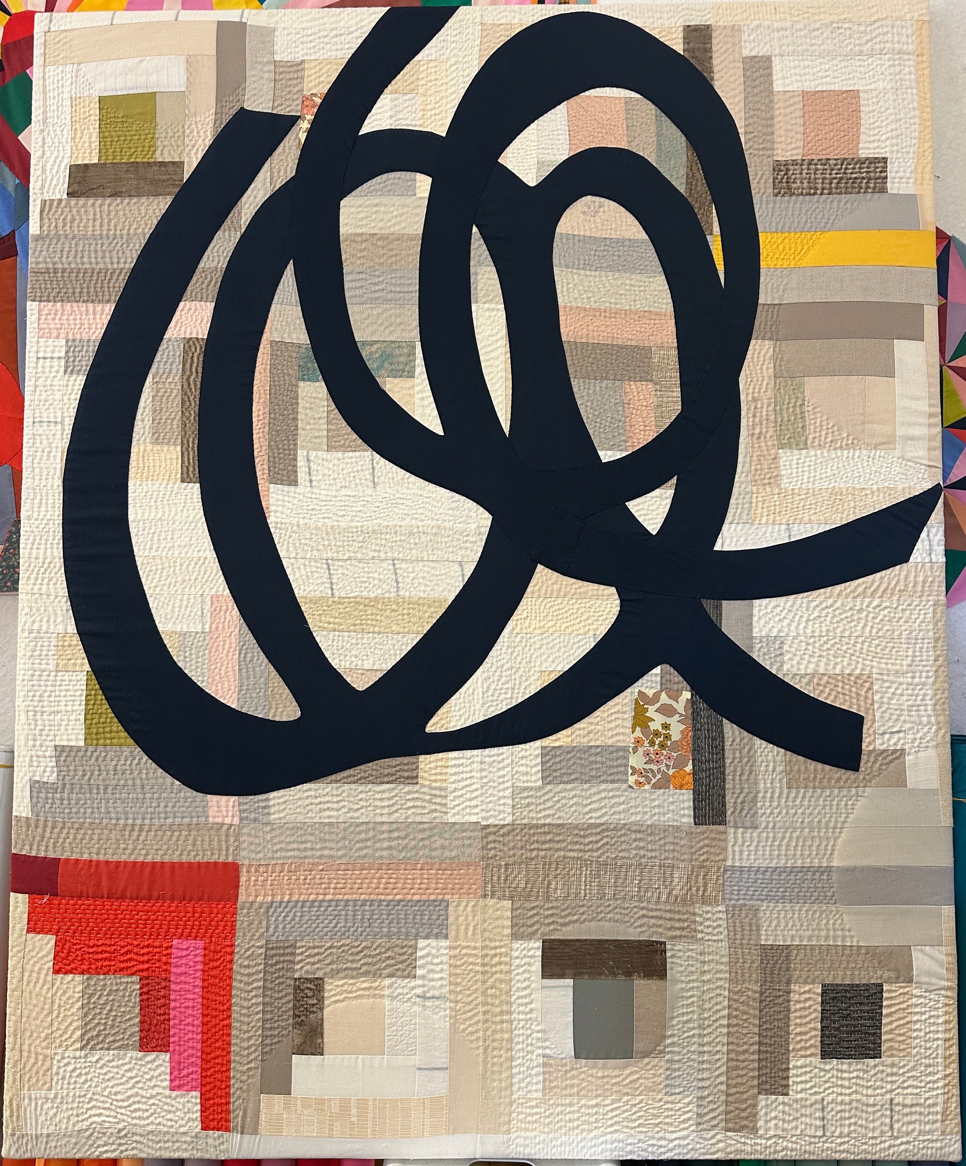 Hand quilted, machine pieced, and hand appliquéd, this textile work by Annabel Wrigley is created from vintage, found, and recycled materials. Loops of black cut across a ground of muted tones, suggesting shadow and silence. The textures of worn fabric, stitched with care, give form to memory and feeling. A La Racine exclusive.